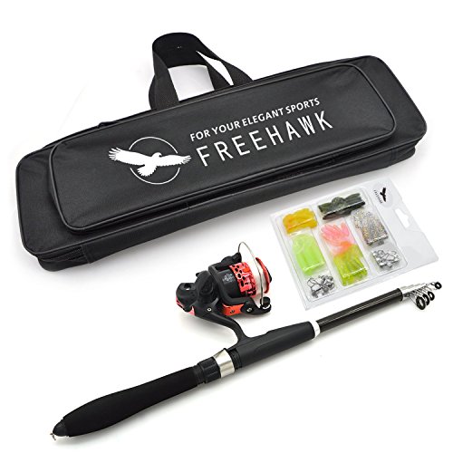 - This is a kind of portable lure rod suit, including a telescopic fishing rod, a fishing reel with fishing line, artificial baits & fishing hooks kit, and a 50cm/19.7in portable fishing bag.